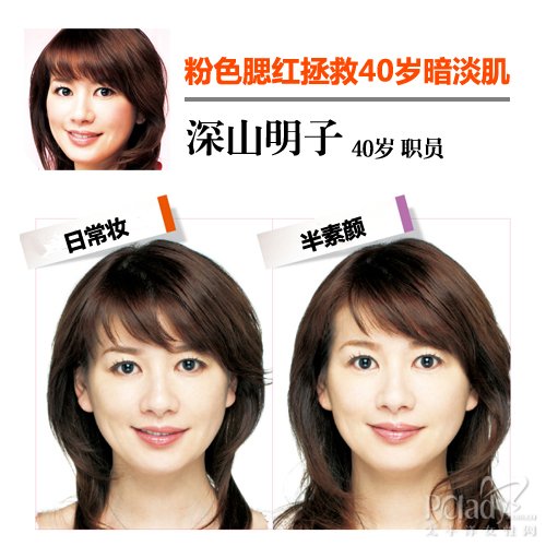 40岁的深山明子,肌肤保养的较好较为 白皙,缺陷是肤色略显暗淡显得有点憔悴,看起来并非十分健康,所以她让自己看起来更年轻的秘诀就是腮红的使用。