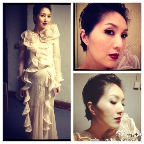 夸张的荷叶边装饰礼服,用宽大的装饰物分散我们对大肚子的关注,但是并未成功。反而颇有妖艳之感的妆容让人眼前一亮。