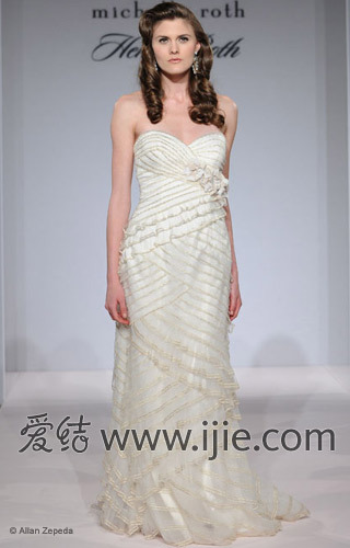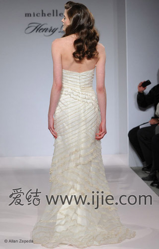 在2013春夏纽约婚纱时装周上,Henry Michelle Roth每款婚纱都有一个小浮夸的点,比如透明胸衣龙骨、或者蛋糕塔裙,而粉色、蓝色和香槟色婚纱也颇有新意。