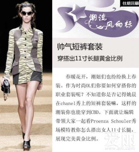 春暖花开,潮妞们也纷纷换上春装。作为时尚OL们你要如何穿搭你的职业套装呢?不知道你是否记得姚晨在chanel秀上的短裤套装嘛,这样的潮装你也能穿到CBD。下面就让编辑带领大家一起看Proenza Schouler秀场模特教你怎么搭出女人11寸长腿,展现完美黄金比例。