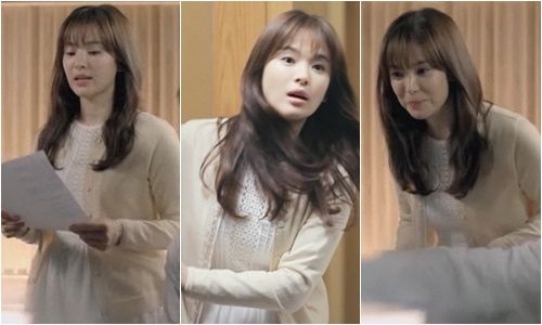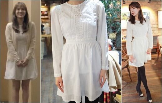 宋慧乔以白色连衣裙和米色开衫打造了清纯可爱的魅力,尤其是胸部增添的细褶纹装饰倍添了她的可人魅力。