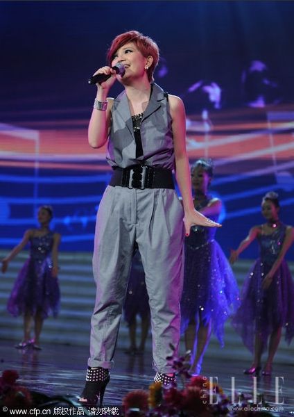 最近刚刚推出新唱片的杨丞琳,最近在各地进行着巡回宣传活动。这条橘色底的波点连底裤十分俏皮可爱,腰间的宽大银色腰带十分抢眼。