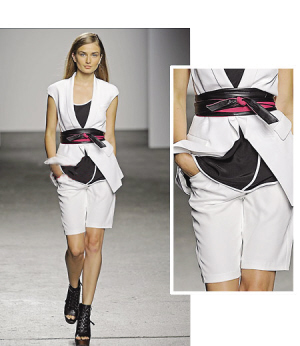 黑白搭配多年来,一直被时尚圈称之为经典组合。原因之一,它们是最保险的颜色搭配,即使对自己品味抱有怀疑,黑白也不会让你跑偏的太过于离谱。白色五分裤可以搭配你任何的上装,或职场、或休闲。宽腰带和厚底高跟鞋,从春天就开始火热起来,它们可是现在的最夯流行!