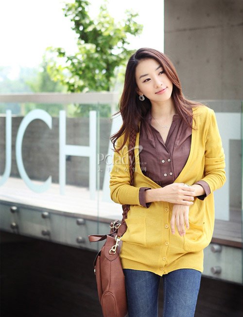 褐色衬衫很见品质,混搭土黄色针织开衫,给严肃的色彩带来了俏皮的味道,不显古板。穿着这种宽松型开衫,下身以修身搭配为最佳。