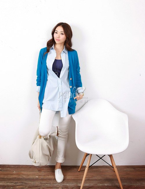 天蓝色男友式衬衫搭配中长款开衫,穿出了潇洒的味道。错扣的纽扣带出了顽皮的味道,随意的衬衫衣角显得休闲自然。