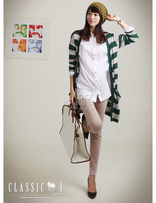设计规矩的白色衬衫搭配灰绿条纹针织衫,一条紧身铅笔裤平衡了上身的臃肿,显出了身材的纤细感。这种长裤的衬衫和开衫,没有高挑好身材,很难穿出感觉。