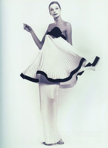这条礼服裙出自Pierre Cardin之手,为50年代设计,假两件式是其风格重点。内里为一条修身长裙,强调女性优美的曲线。在抹胸散开A形短裙,并以黑色滚边装饰。百褶面料具有收缩功能,走动时更有垂坠感。当穿着礼服优雅旋转,圆形裁剪形成美丽弧线——荷叶边翩翩飞舞起来。Pierre Cardin用简洁的廓型打造出富有动感的设计,利用面料自然的褶皱诠释飘逸之美!