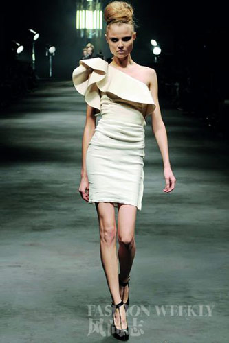 夸张:Lanvin秀场上的紧身单肩裙,一侧有宽大的荷叶边,从胸口沿上的曲线在手臂上堆积出漂亮的褶皱。相似的设计还可以出现在领口,仿古典样式的褶皱在两侧放大出迷人的曲线。就像Viktor& Rolf秀场上的蕾丝短裙,在深V领两边点缀上荷叶边,顺势向下的垂荡效果非常漂亮。大荷叶边取代了迷你荷叶边更加大气有型,Giambattista Valli 秀场上的荷叶边,其实就是褶皱的放大版,通过夸装处理强调裙装的廓型。