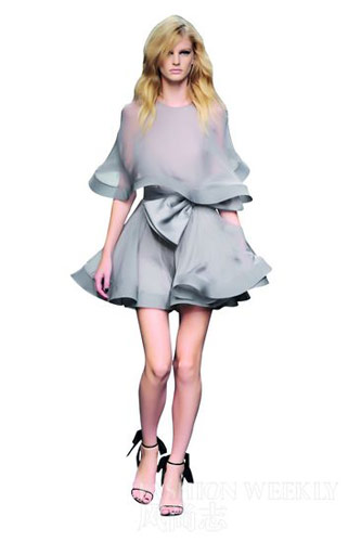 立体:Valentino这季整场秀完全就是以荷叶边为主题,开场模特Anna Selezneva穿着的鹅黄色薄纱裙,就是由螺旋的荷叶边组成。不过让人叫绝的,还是立体荷叶边效果。设计组合Maria Grazia Chiuri和Pier Paolo Piccioli在轻透的薄纱下支撑硬质宽带,裙摆膨胀形成柔和的曲线,流畅的线条就像远观时看到的河流,塑造如空气般轻盈的外观极富女人味。女星 Camilla Belle之后就示范了拥有立体荷叶边的烟灰色裙装,柔和的裙摆蜿蜒而行,上下两件式画出美丽弧线。