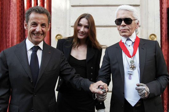 法国总统萨科奇携妻子布吕尼为时尚大帝Karl Lagerfeld颁发勋章