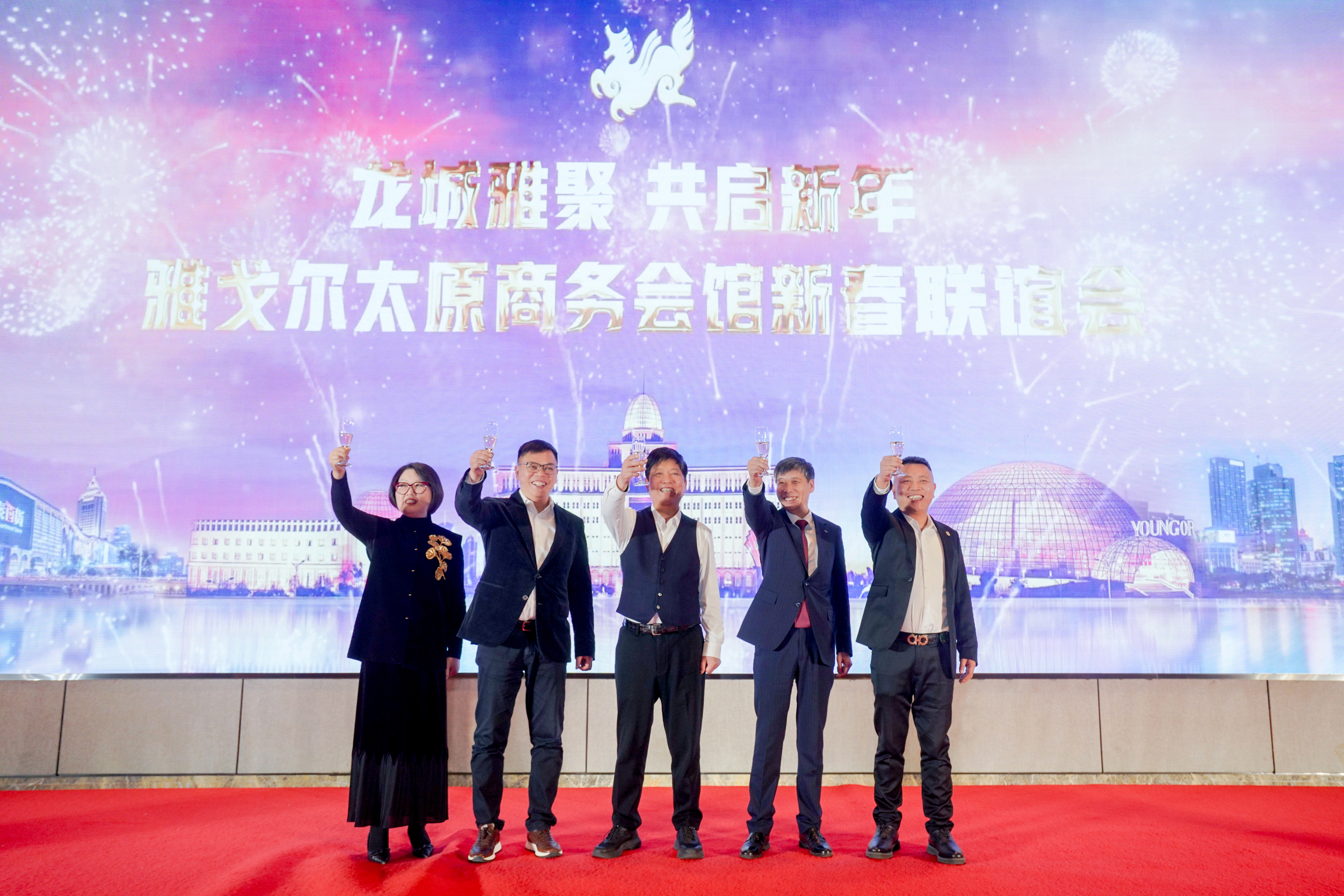 雅戈尔集团董事长李如成,山西省浙江企业联合会会长彭衍吾,山西省浙江企业联合会秘书长林乃贵,雅戈尔服装控股副总裁陆萍,雅戈尔晋蒙公司总经理鱼建伟共同上台举杯开启新年新征程。
