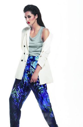 白色长版西服System RMB 3,250灰色纯棉背心+J RMB 148丝绵印花长裤Me&City RMB 299